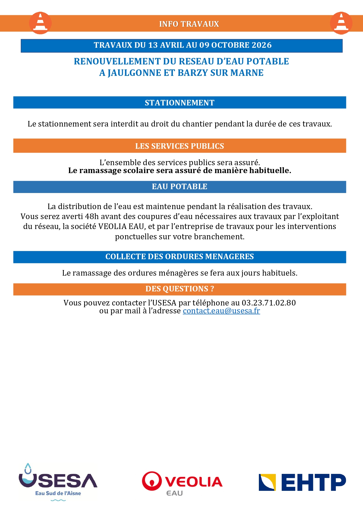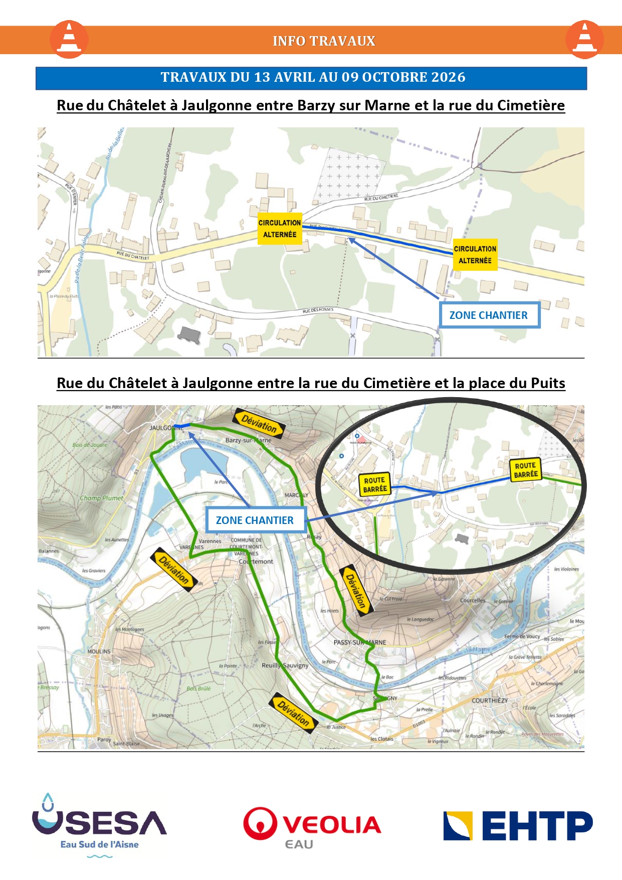 Des travaux de renouvellement du réseau d’eau potable vont être entrepris à partir du 13 avril 2026 rue du Port, rue du Châtelet et rue des Fossés à JAULGONNE ainsi que rue de La Fontaine Chandelue à BARZY SUR MARNE. 1485 mètres de canalisation et 84 branchements seront renouvelés.
