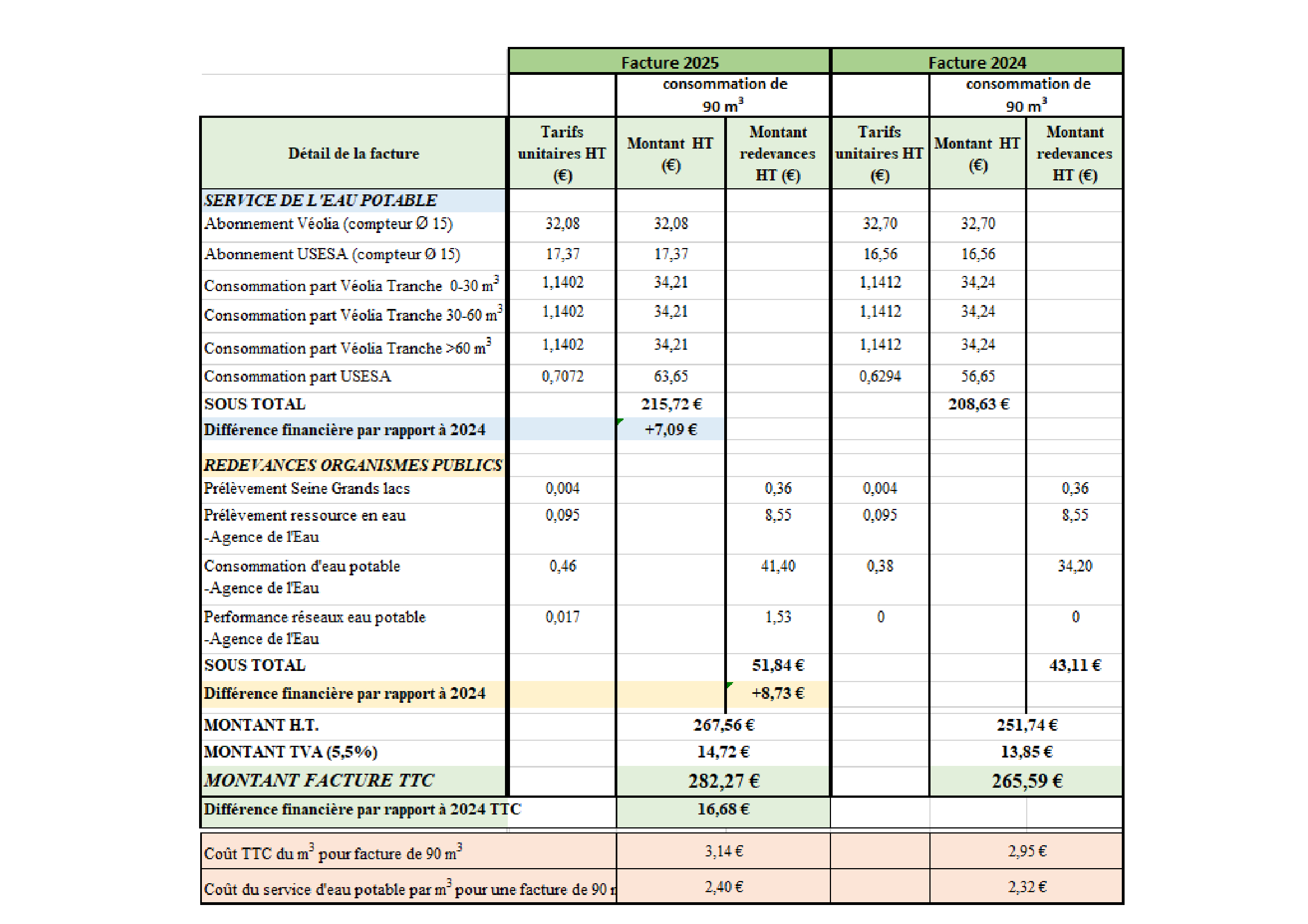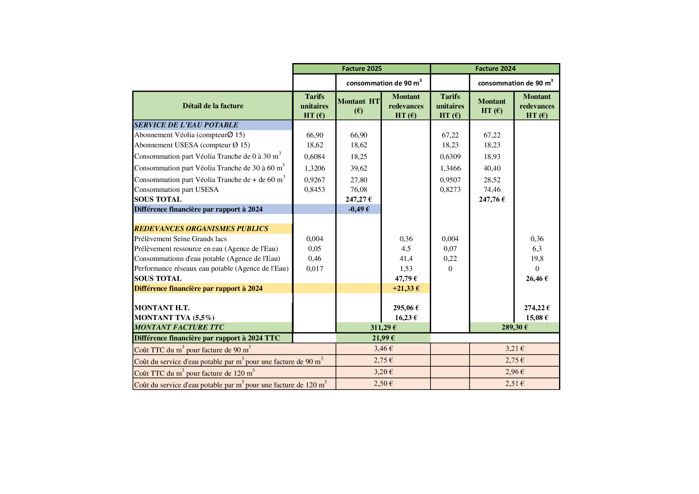 Vous trouverez ci-dessous trois tableaux comparatifs entre les tarifs 2024 et 2025 pour une consommation de 90 m3 (volume moyen consommé par un abonné de l’USESA). Cette facture ne concerne que l’eau potable. Concernant la part assainissement, vous pouvez contacter la collectivité compétente en assainissement de votre territoire.