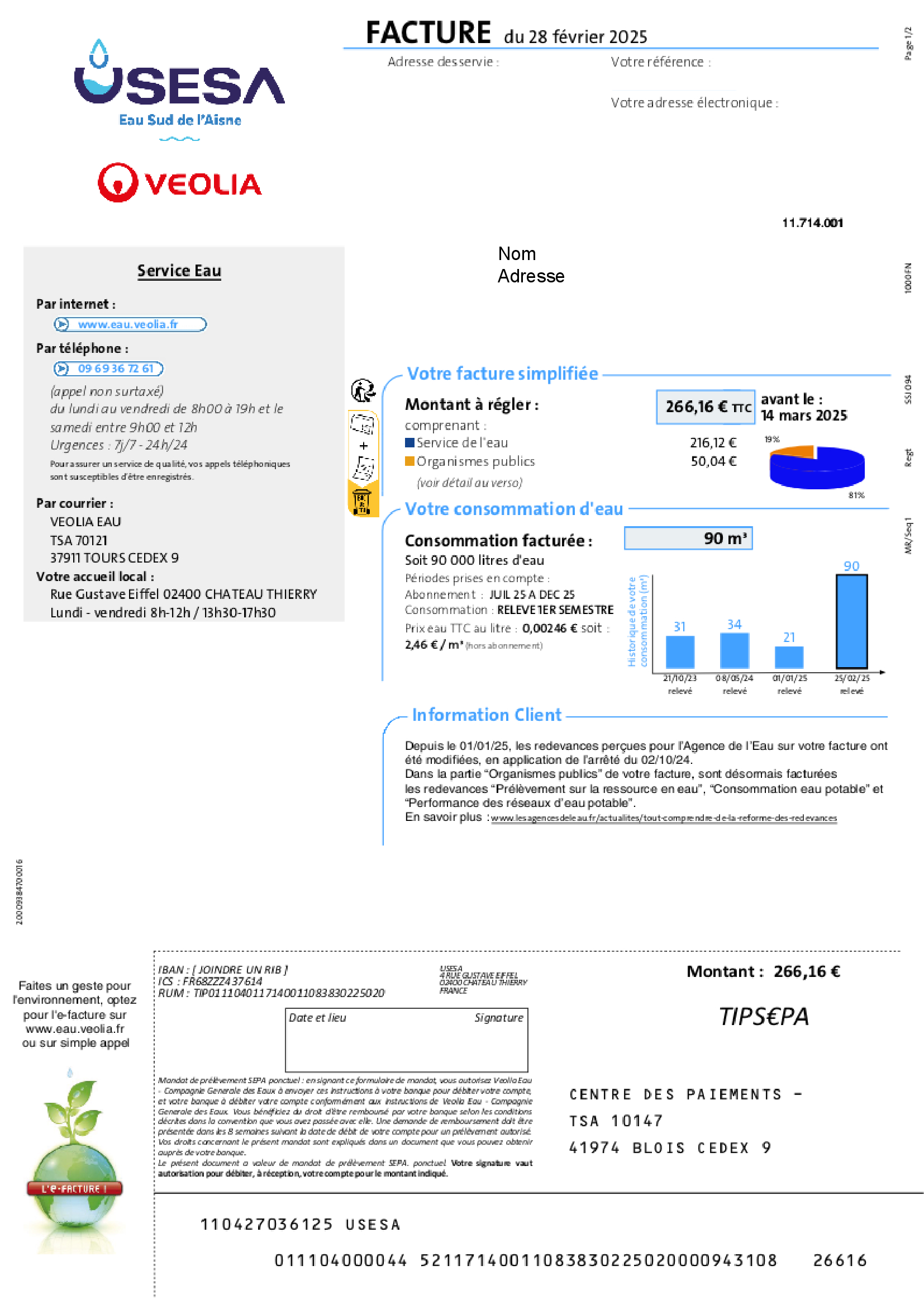 Pour les communes de Breny, Brécy, Coincy, Courmont, Nogentel, Pavant, Sergy, Viels-Maisons (communes ayant adhéré à l’USESA depuis 2021) : tarifs spécifiques avec un lissage mis en place jusque fin 2026.