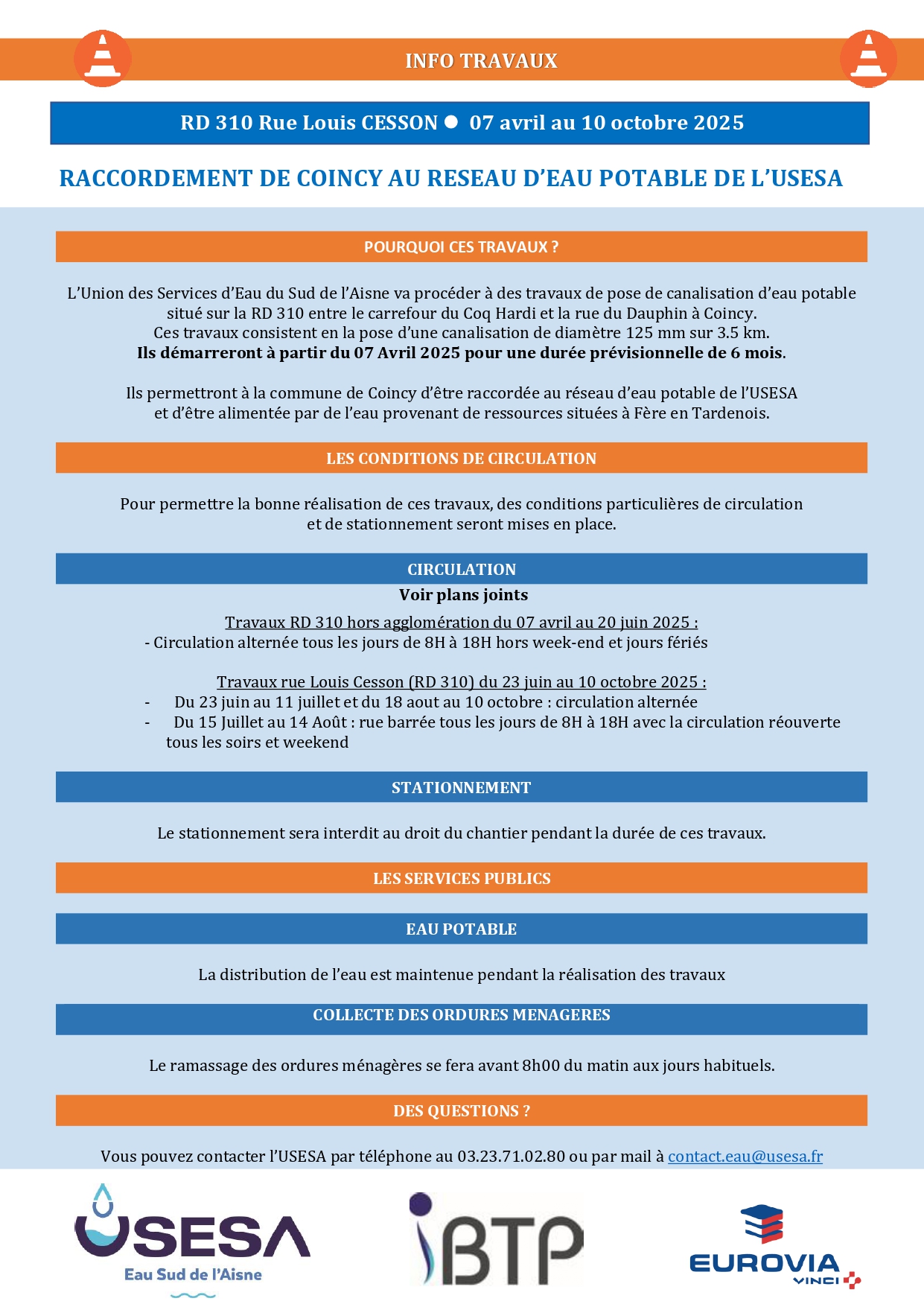 Grâce à cette opération, la commune de Coincy sera alimentée de façon permanente par les ressources de Fère en Tardenois et secourue par la prise d’eau en Marne.