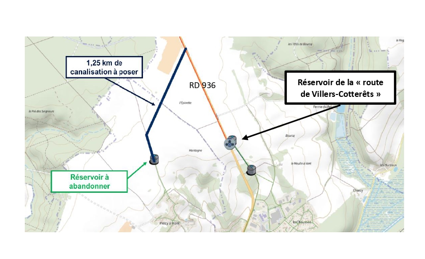 • Transit simplifié : L’eau transitera par le réservoir de la « route de Villers-Cotterêts » (RD 936), permettant ainsi de mutualiser l’utilisation de cet ouvrage récent