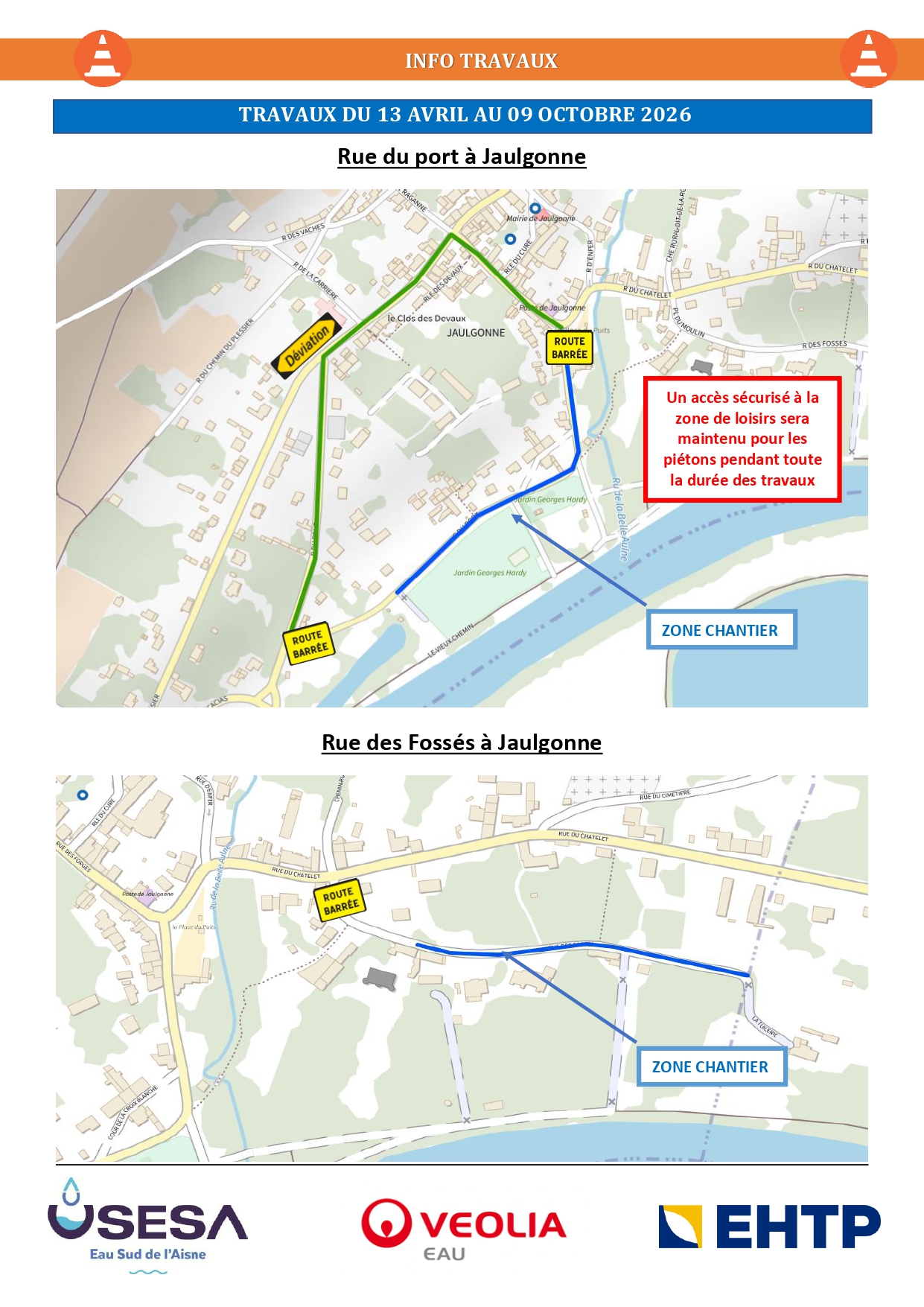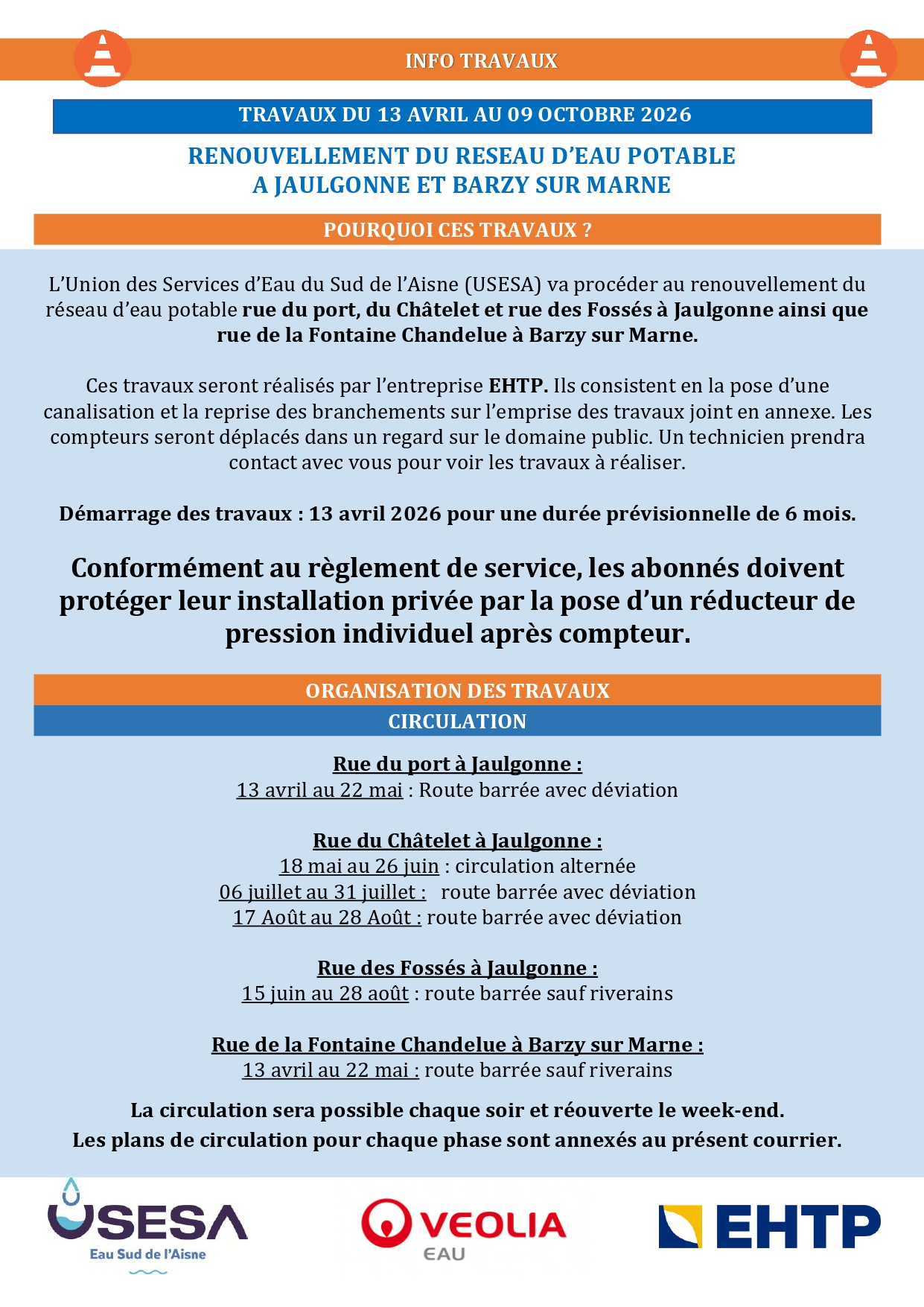 Des travaux de renouvellement du réseau d’eau potable vont être entrepris à partir du 13 avril 2026 rue du Port, rue du Châtelet et rue des Fossés à JAULGONNE ainsi que rue de La Fontaine Chandelue à BARZY SUR MARNE. 1485 mètres de canalisation et 84 branchements seront renouvelés.