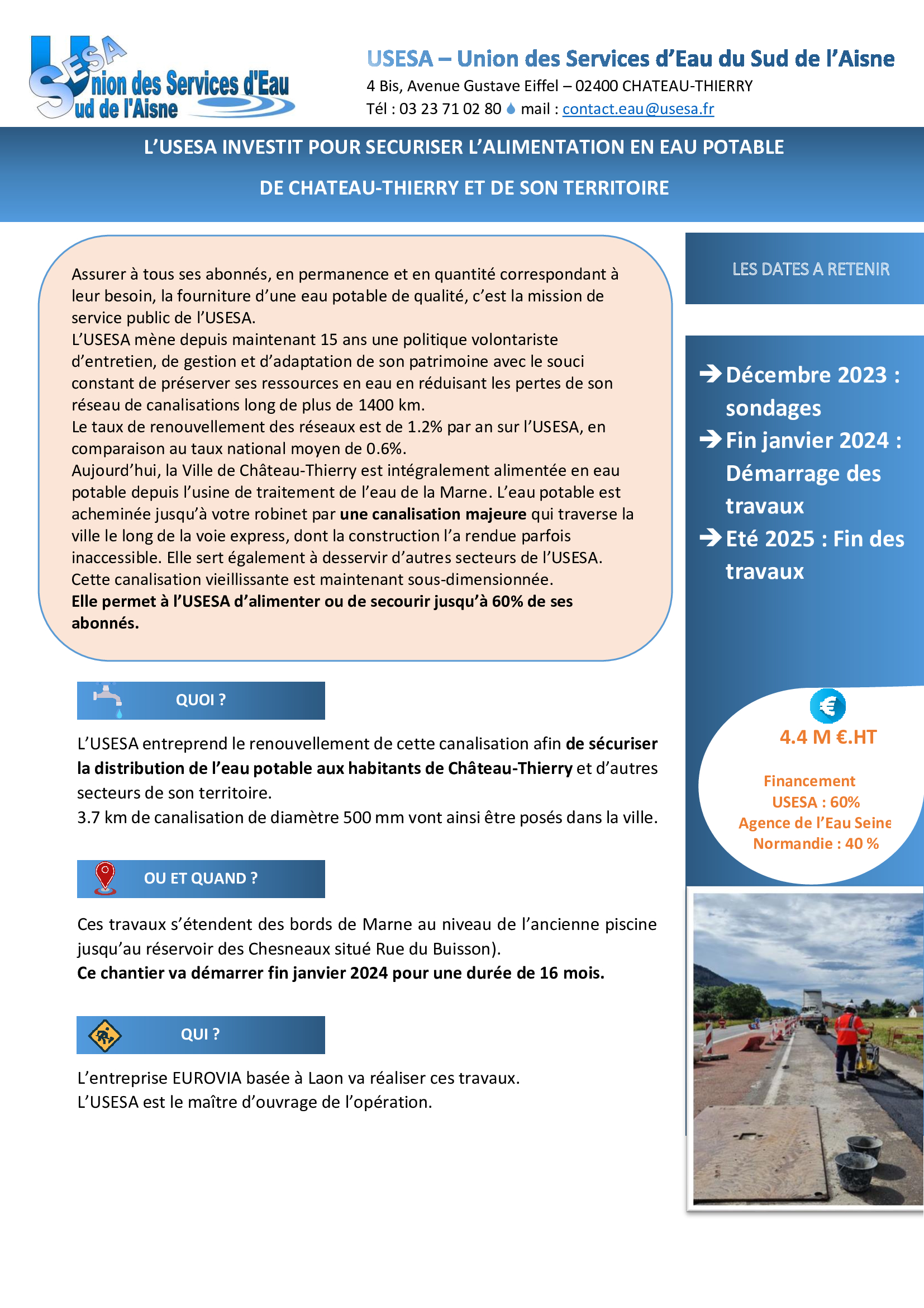 Des travaux d’eau potable vont être réalisés par l’USESA dans plusieurs rues de Château-Thierry à compter de fin janvier 2024 pour une durée de 16 mois.