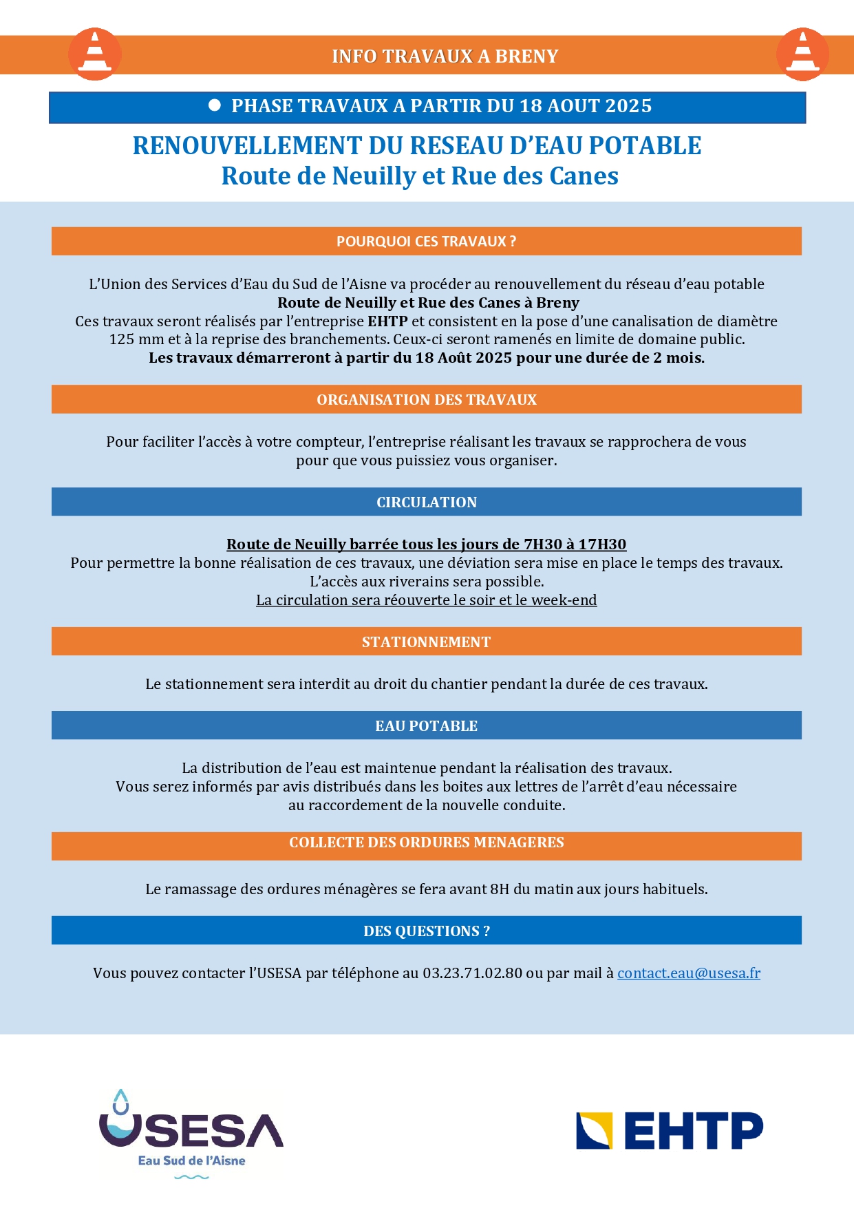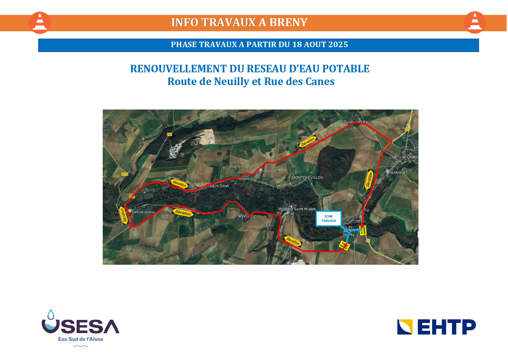Des travaux de renouvellement de canalisation d’eau potable vont être entrepris à partir du 18 août 2025 route de Neuilly et rue des Canes à BRENY. Ces travaux vont occasionner des modifications de circulation. Une déviation va être mise en place (voir plan ci-dessous).